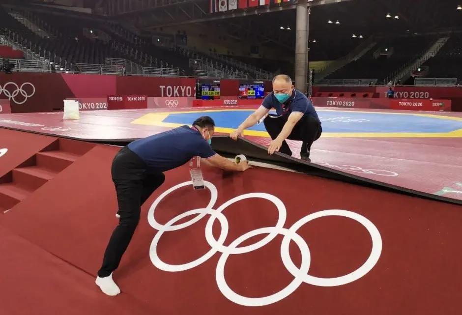 2021年7月20日,日本武道馆——奥运会柔道比赛场地。金年会体育东京奥运会服务保障团队正在布置、安装柔道器材。