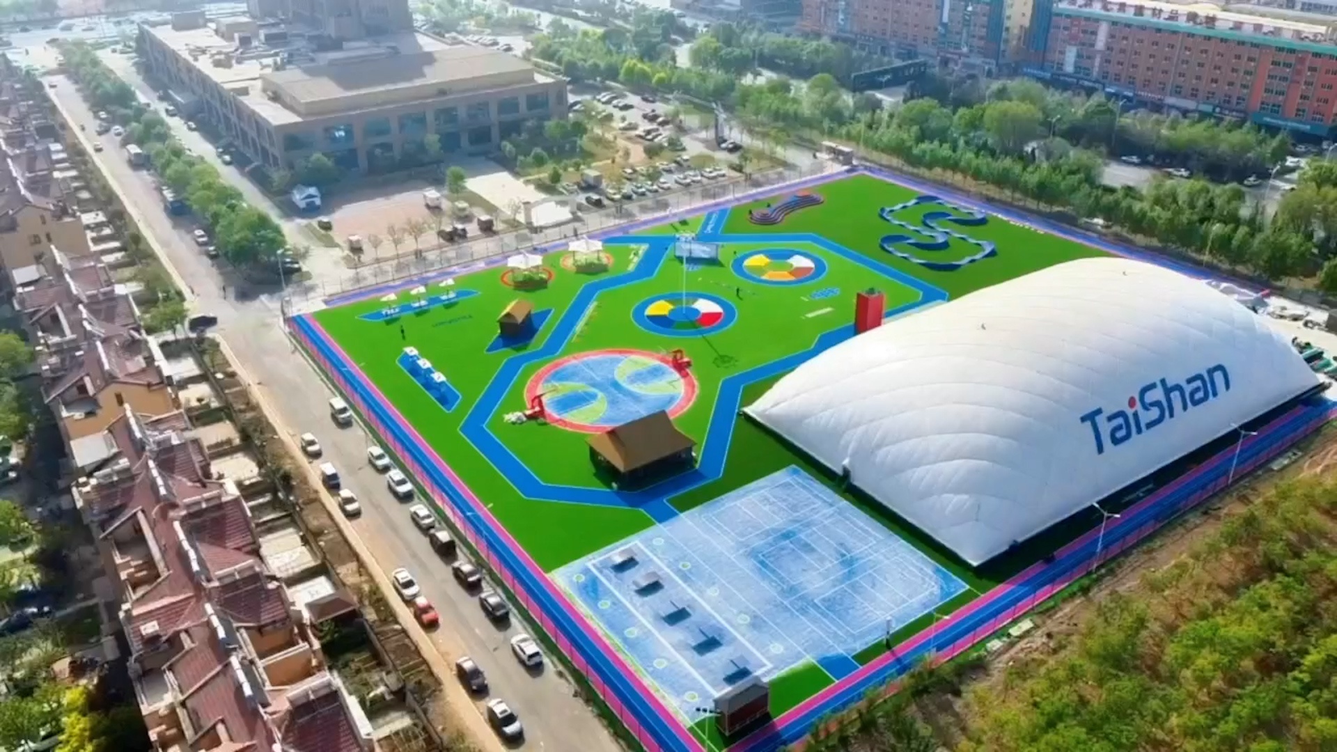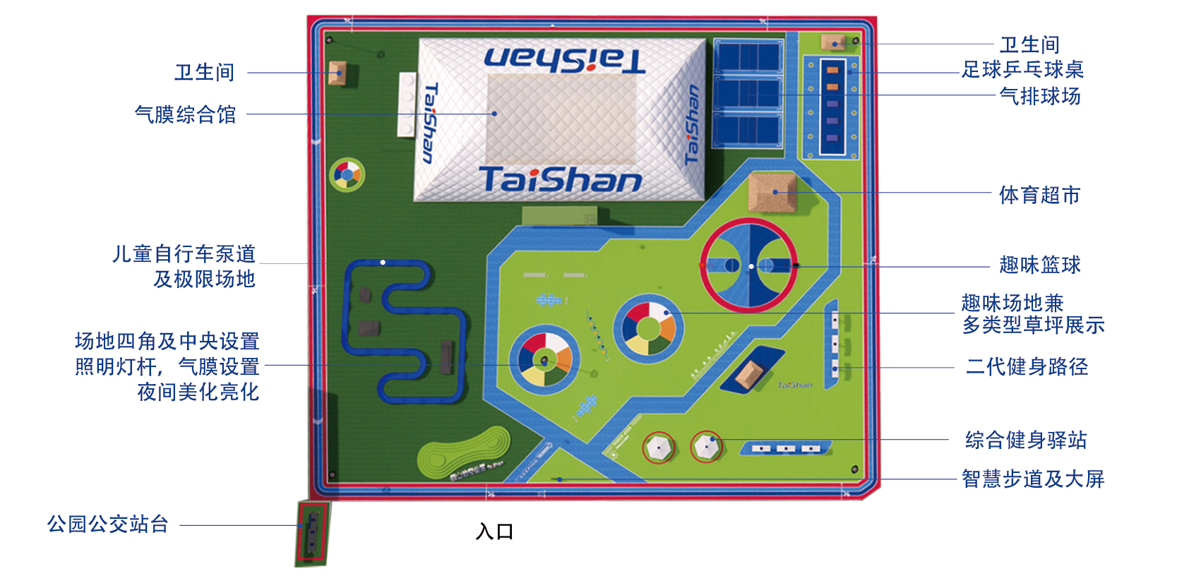 在场地铺设上,均采用金年会新材料功能人造草铺设,全方位保证运动安全和环保;气膜式篮球综合运动馆,内部设置2片篮球场、6片乒乓球场地及1片网球场。网球场同时套线4个羽毛球场地。场馆内可以满足体育运动,体育教学及群众比赛需求。从场馆到运动超市、智慧体测小屋,全部采用可装配式建筑。